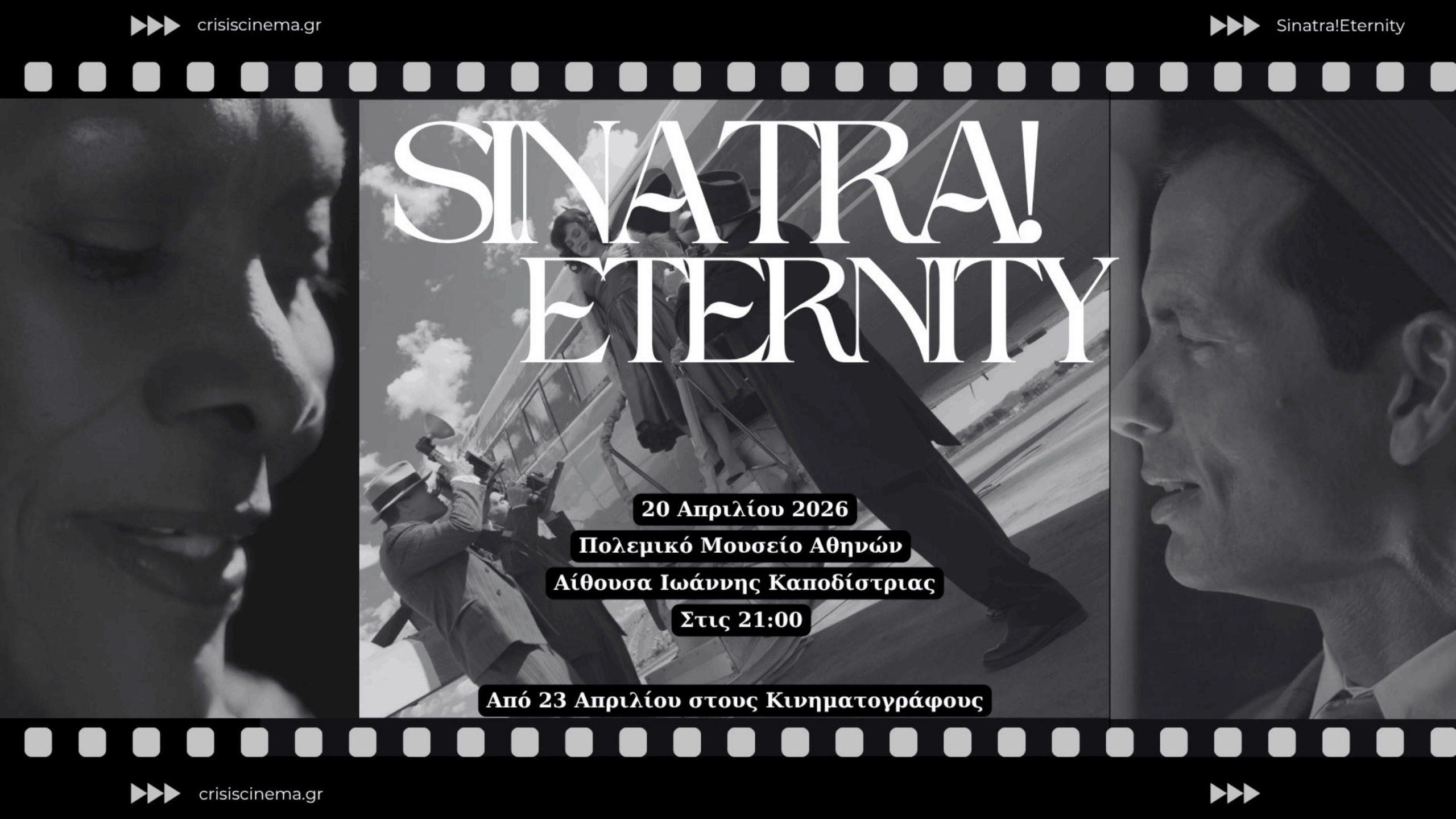 Η εταιρεία παραγωγής Crisis Cinema έχει την τιμή να παρουσιάσει την πρεμιέρα της ταινίας «Sinatra! Eternity», η οποία θα πραγματοποιηθεί τη Δευτέρα, 20 Απριλίου 2026, στις 21:00, στο Πολεμικό Μουσείο Αθηνών (Αίθουσα Ιωάννης Καποδίστριας). Η ταινία θα κυκλοφορήσει στις αίθουσες στις 23 Απριλίου στην Ελλάδα και Κύπρο και αρχές ΜΑ’ΙΟΥ ΗΠΑ και Καναδά Η Ταινία: Το «Sinatra! Eternity» δεν είναι μια κλασική γραμμική βιογραφία, αλλά μια διεισδυτική καλλιτεχνική ματιά στις πιο κρίσιμες στιγμές του «Θρύλου». Η ταινία εστιάζει: Στην κρίση της φωνής του στα τέλη της δεκαετίας του ’40. Στην καλλιτεχνική του αναγέννηση με την κατάκτηση του Oscar για την ταινία «From Here to Eternity» το 1953. Στη θυελλώδη και παθιασμένη σχέση του με την Ava Gardner.